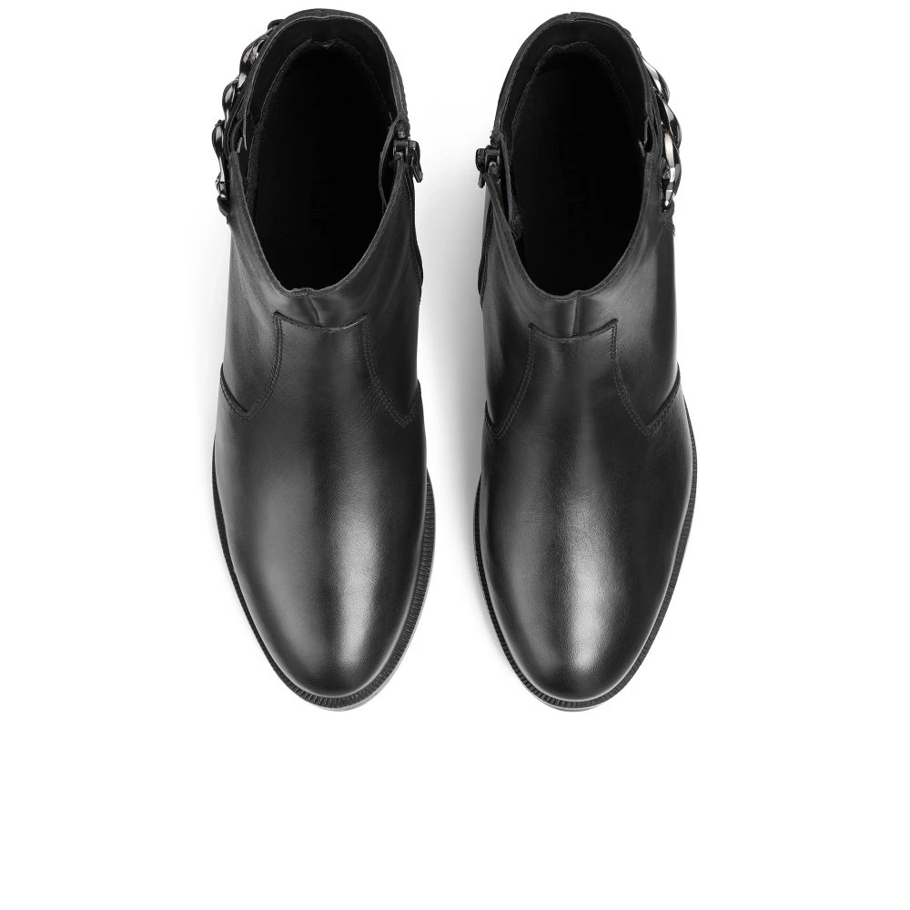 The Alondra smart boot on block heel is a perfect combination of style and comfort. With its versatile look, braided metal chain detail, and high-quality leather material, it’s a must-have in your collection. Available in classic black and natural tan finish.