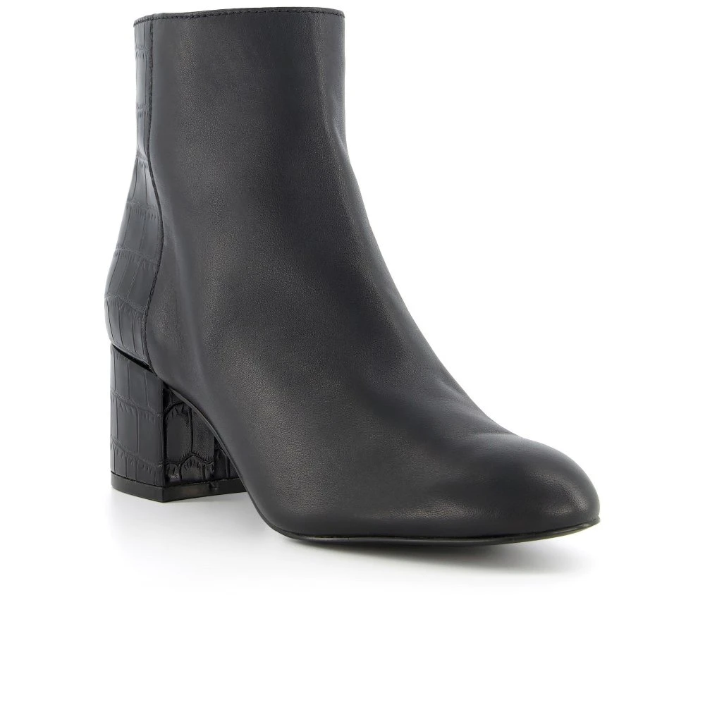 A chic and classic pair of ankle boots that will be your everyday go-to style. The mid height block heel making them perfect or all-day wear. Featuring moc croc detailing and a gold intertwined initial logo on the back