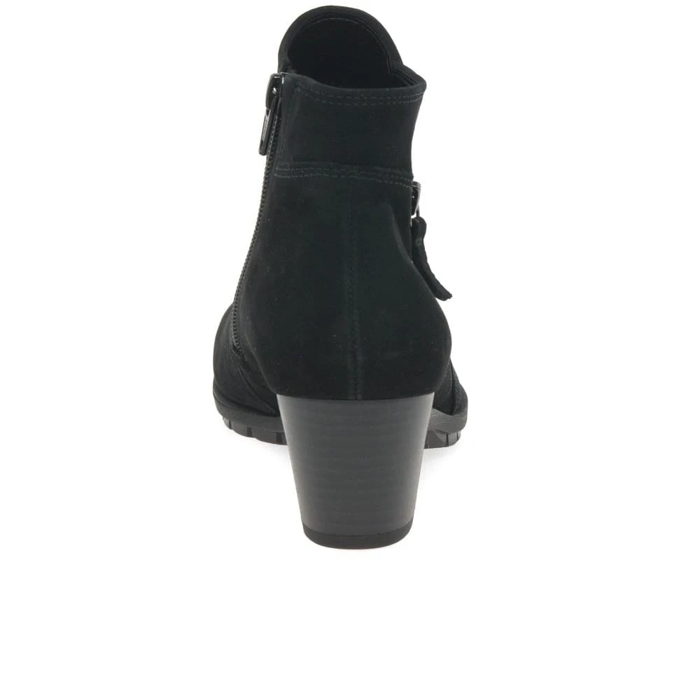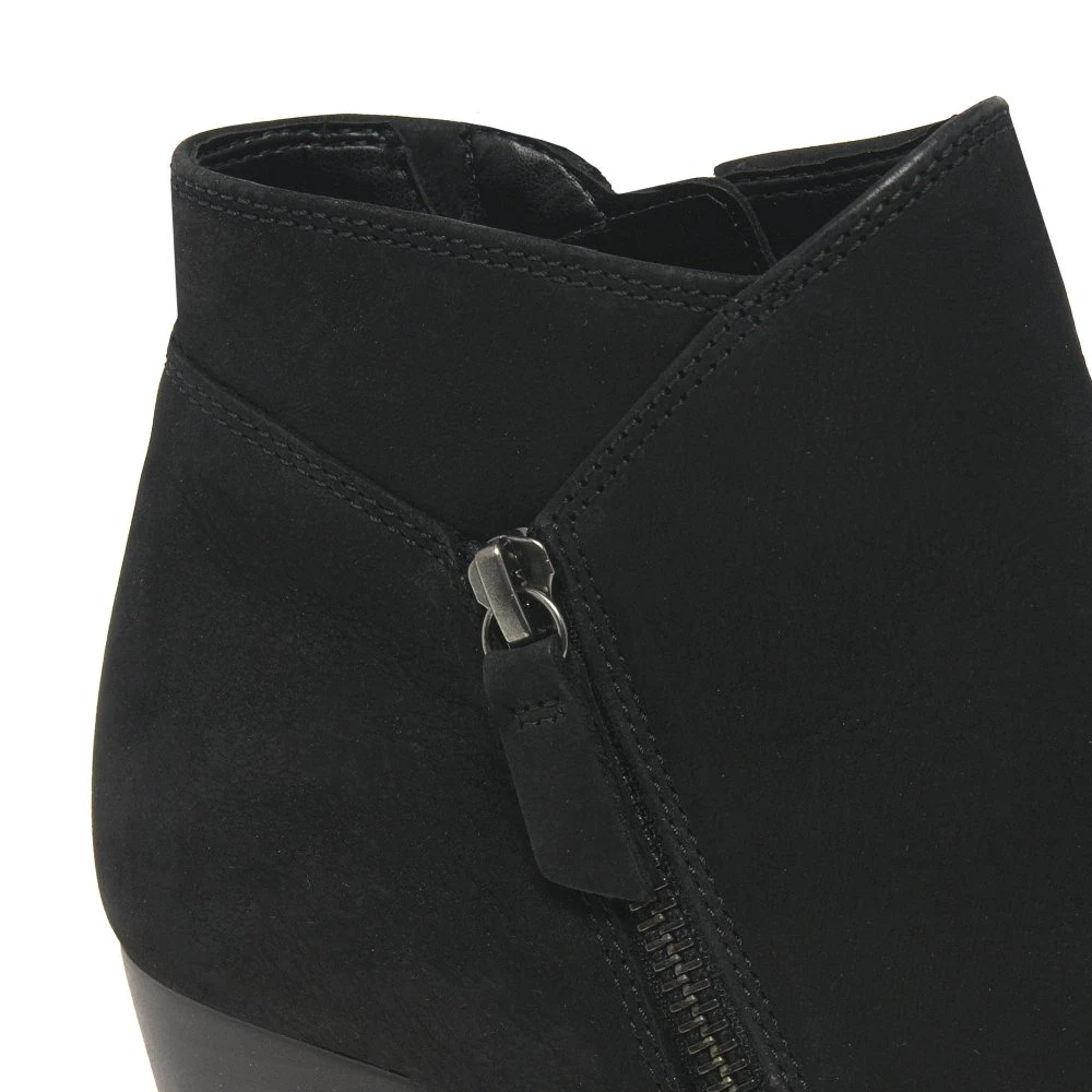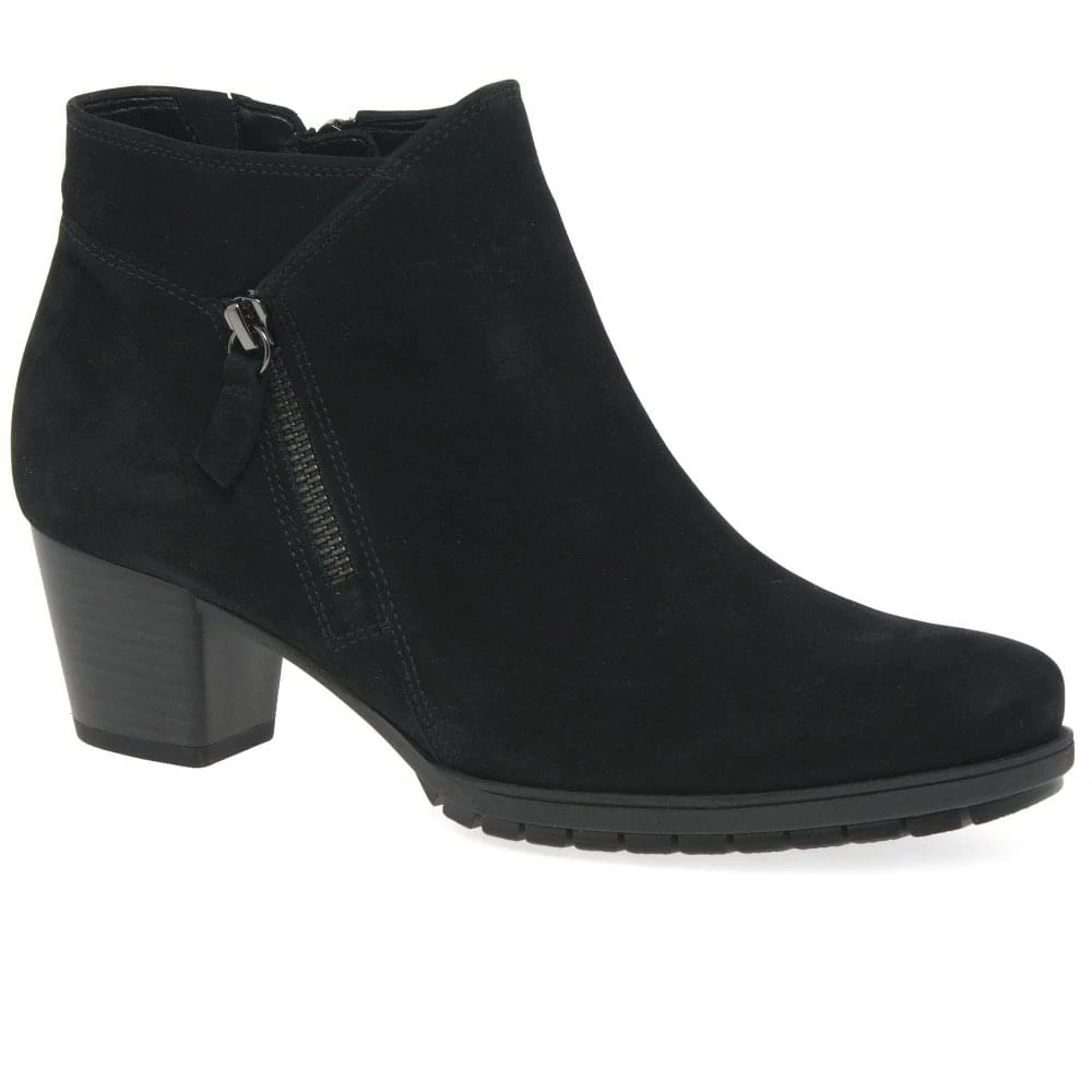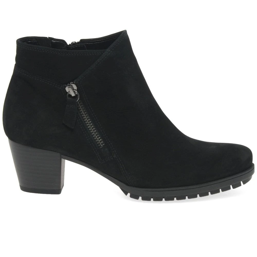 Their asymmetric top line sets Gabor’s Olivetti women’s ankle boots apart from the sea of classic black ankle styles out there. Fashioned in luxurious black nubuck leather, they stand upon a solid foundation of cleated and grip inducing rubber soles for slip-free stepping through your busy schedule. A secure inner zip fastening ensures easy access, not to be confused with the outer faux zip trimming added for textural interest. High block heels finish the elegant style.