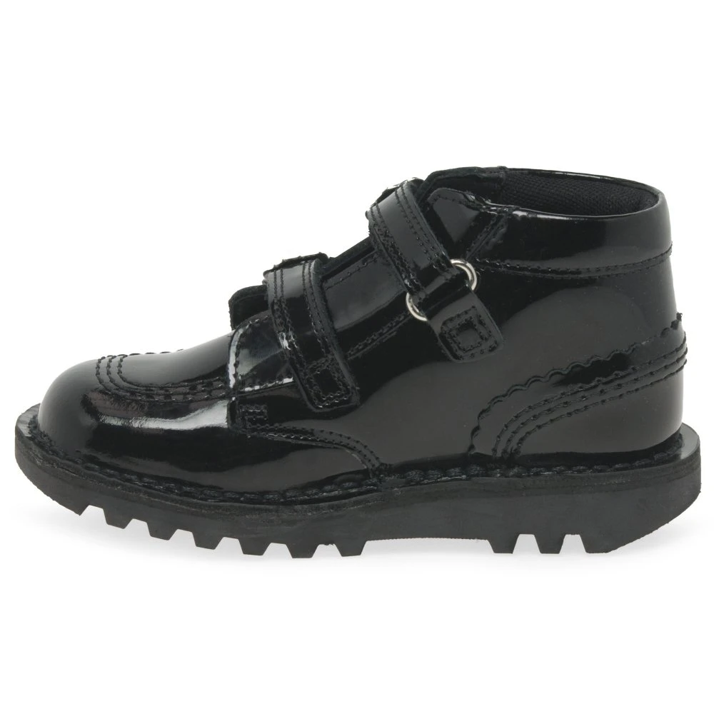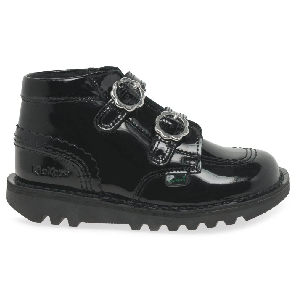 A stylish yet practical pair for the playground, the Kickers Hi Vel Bloom girls boots feature patent leather uppers and durable rubber soles. Dual rip-tape fastenings ensure an adjustable but secure fitting, whilst floral buckle detailing adds a fun touch to their uniform.