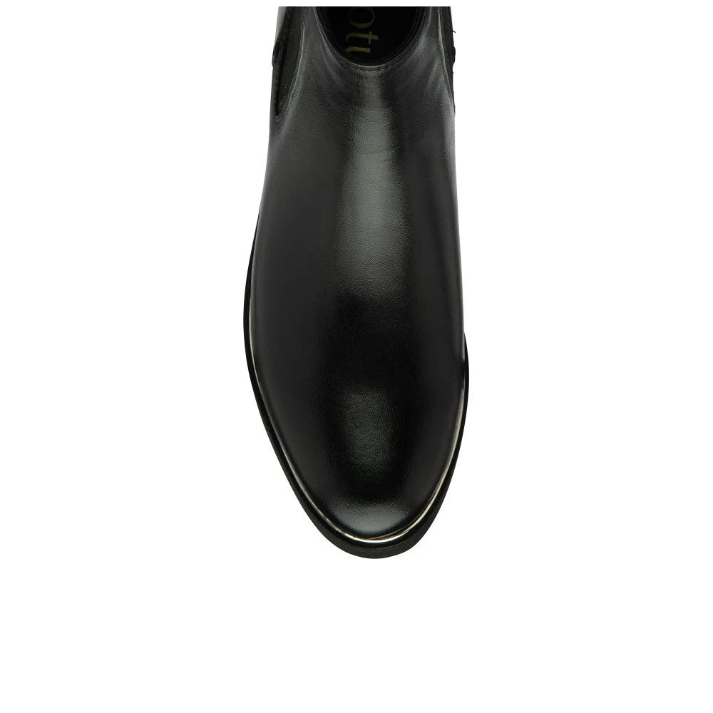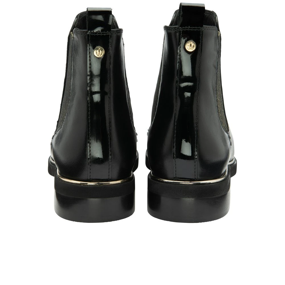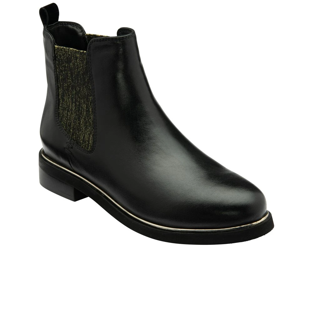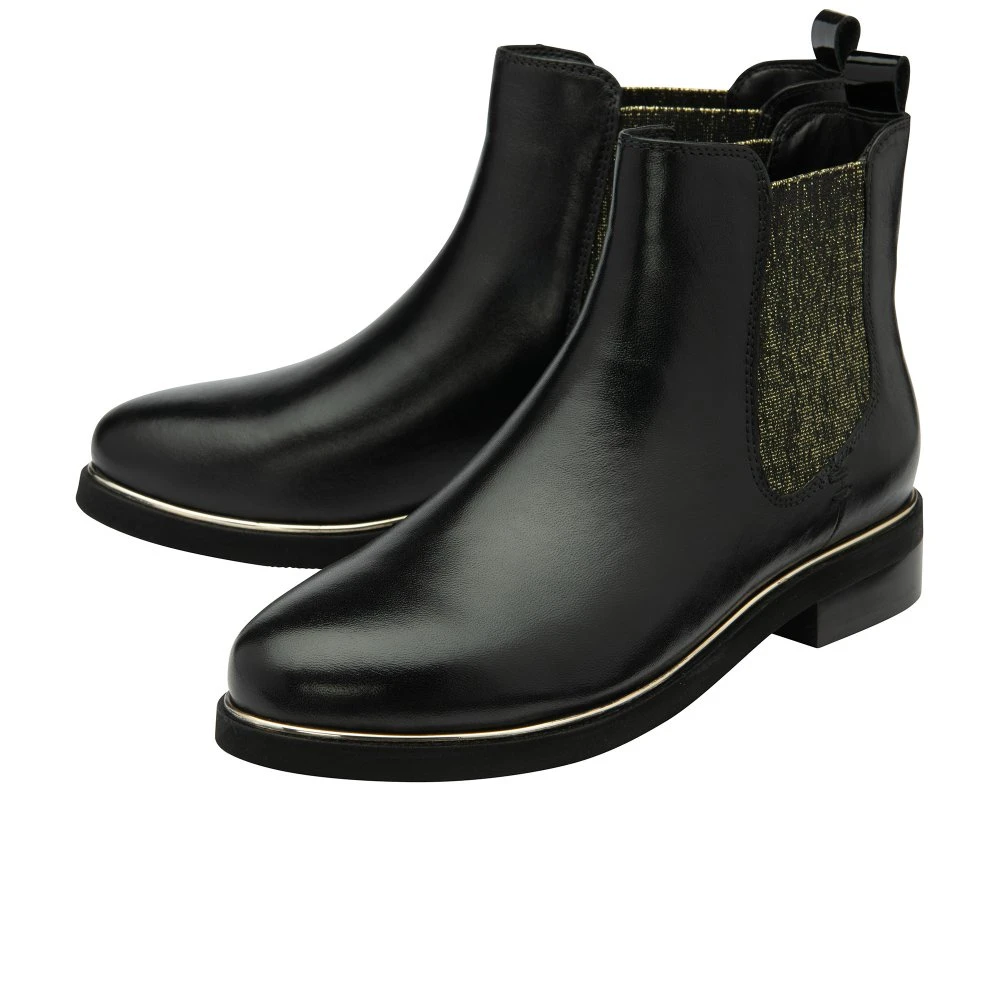 Exuding understated glamour is the Lotus Amara Chelsea boot! This leather, round toe ankle boot rests on a 3cm heel that is finished with a gold trim running around the top line of the outsole and gold thread runs through the elasticated side panels to add a touch of glitz to this classic style. Dressed up or down, this Lotus black ankle boot will certainly add the perfect finishing touch.