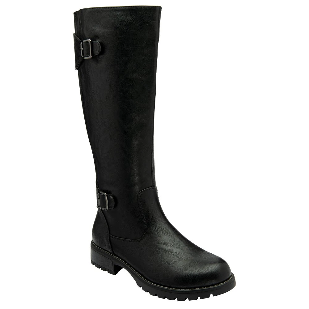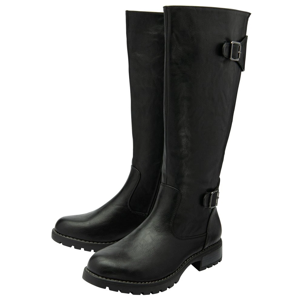The Brandi knee high boot is a must-have wardrobe staple. An equestrian theme is prevalent on this Lotus women’s knee high boot. This boot features buckle detailing enhancing the black faux leather upper and is set on a sturdy 3.5cm block heel and a cleated sole unit.