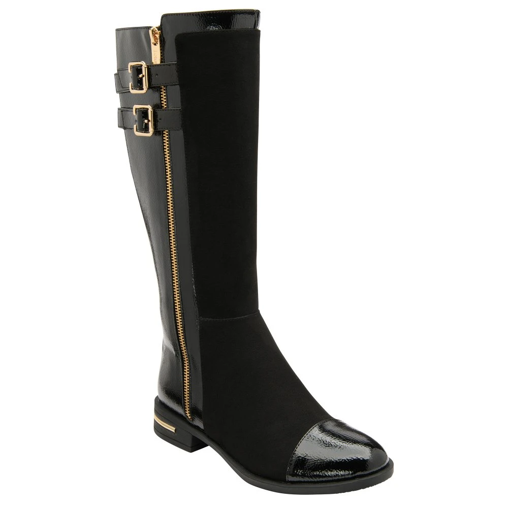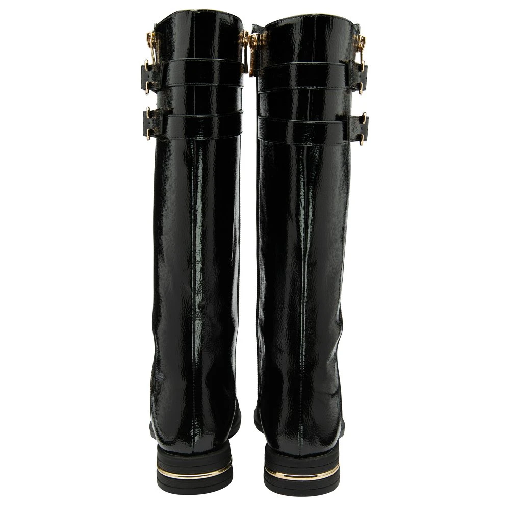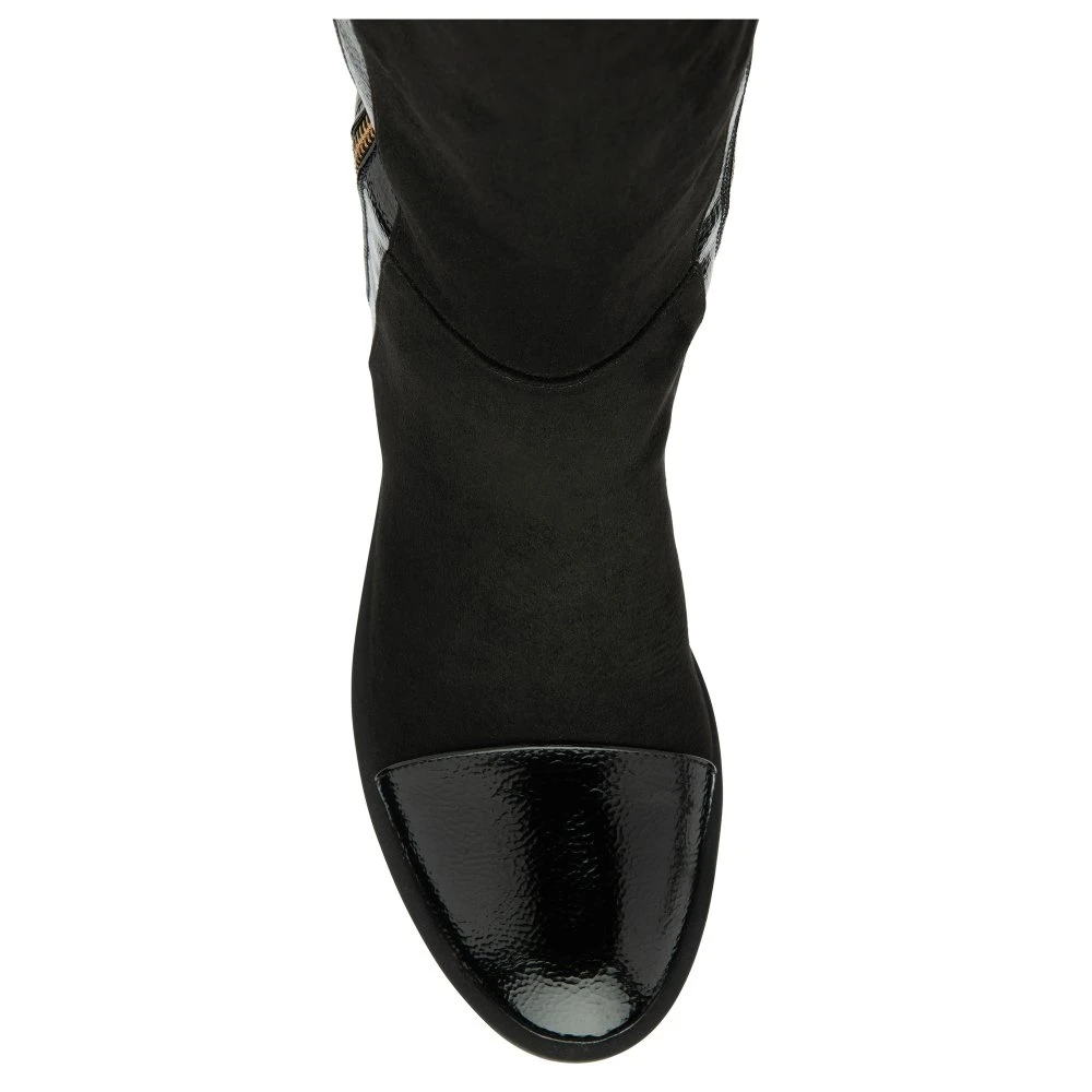 Ramp up your everyday looks with the Lotus Harmonie knee high boot. Glossy patent sits alongside sumptuous textile on the upper, which is further accentuated by an exposed gold zip and a double buckle feature. Finishing this remarkable black boot, that has an equestrian vibe, is a slight 3cm heel that incorporates a decorative metal trim.
