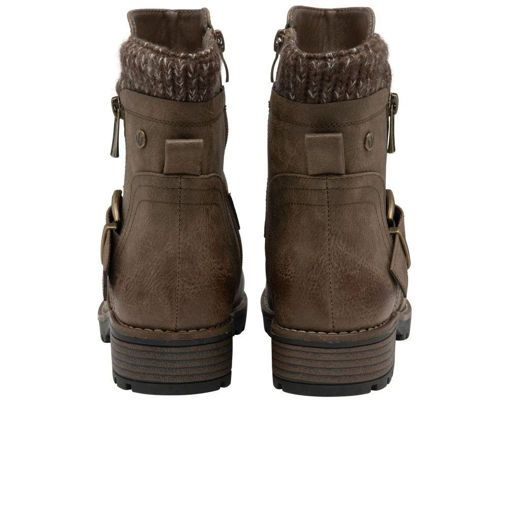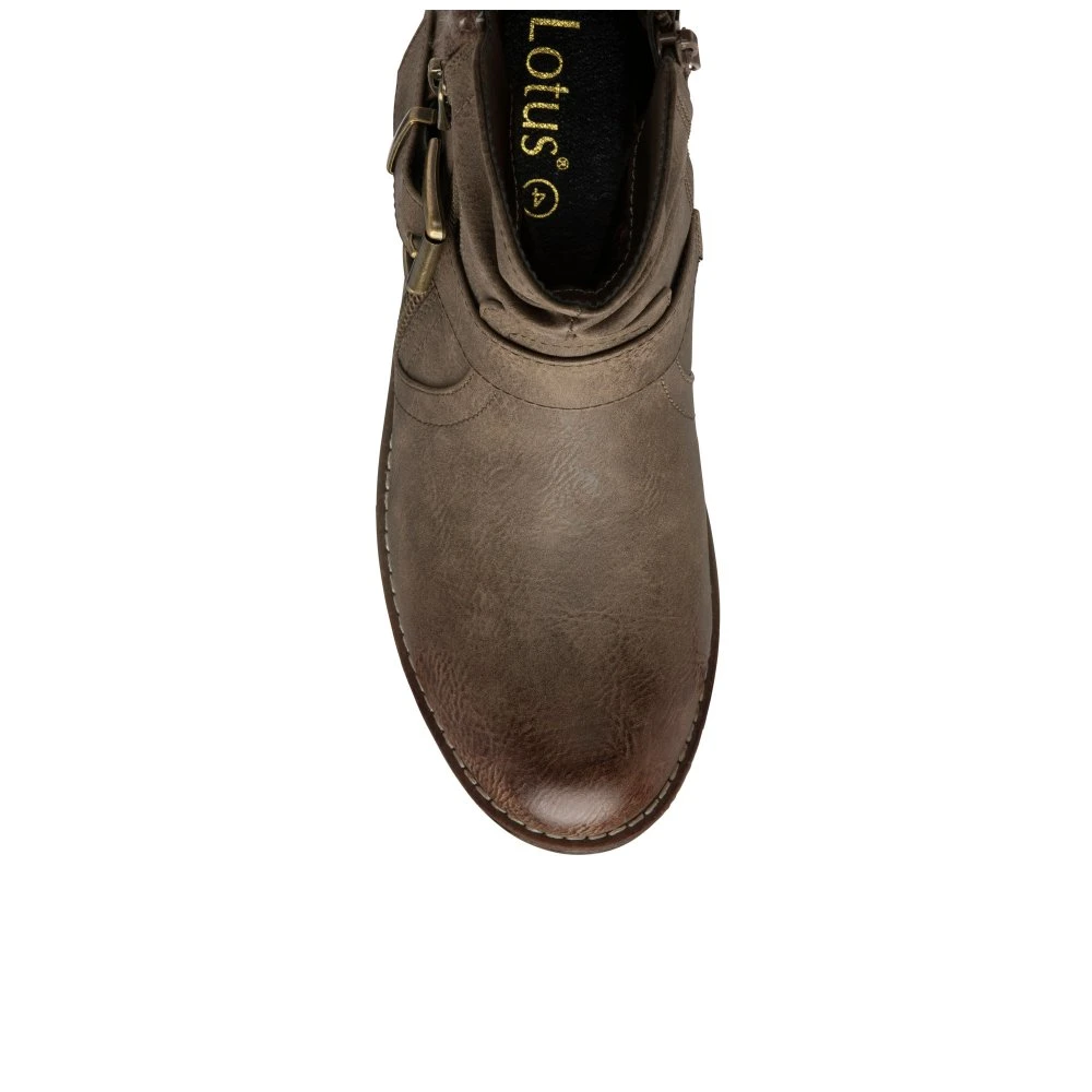 The Jemma biker inspired boots from Lotus will add a fashionable spin to any outfit. This calf length, casual, taupe style features a faux leather upper, a buckle strap trim, a decorative zip, a cleated sole, a knitted textile insert to the collar and a subtle 3.5cm heel.