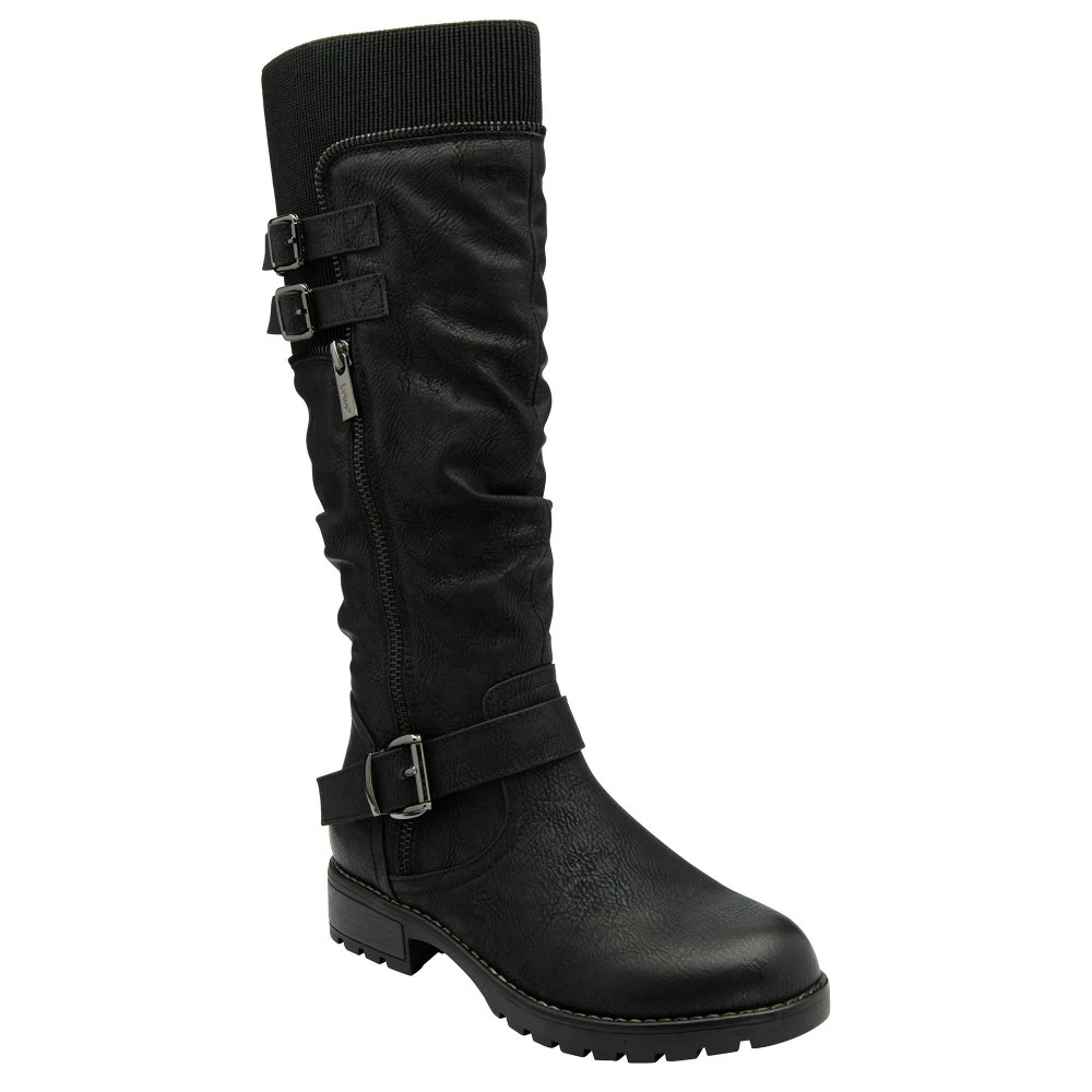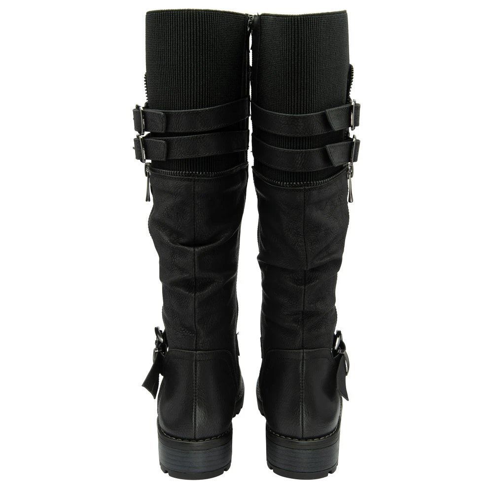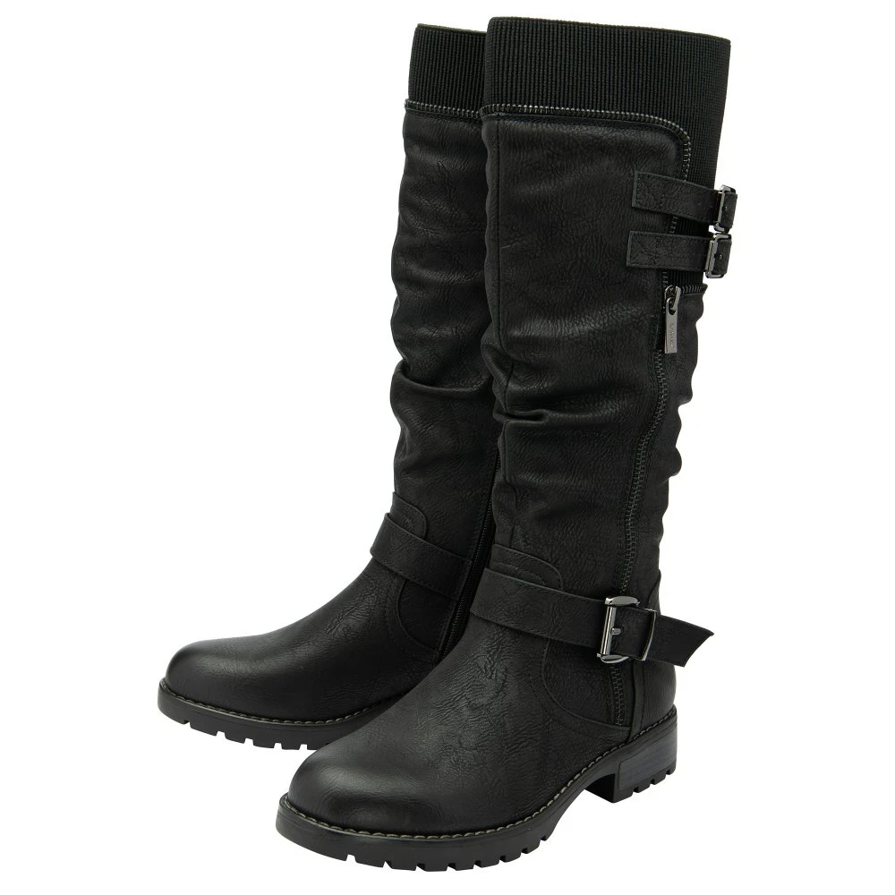 Put your best foot forward in the Lotus Jennifer knee high boot. Enhancing the slouchy leg of this faux leather style is buckle detailing, exposed zip and a knitted fabric top collar. This boot is exceptionally wearable due to the 3.5cm block heel and the functional inside zip.