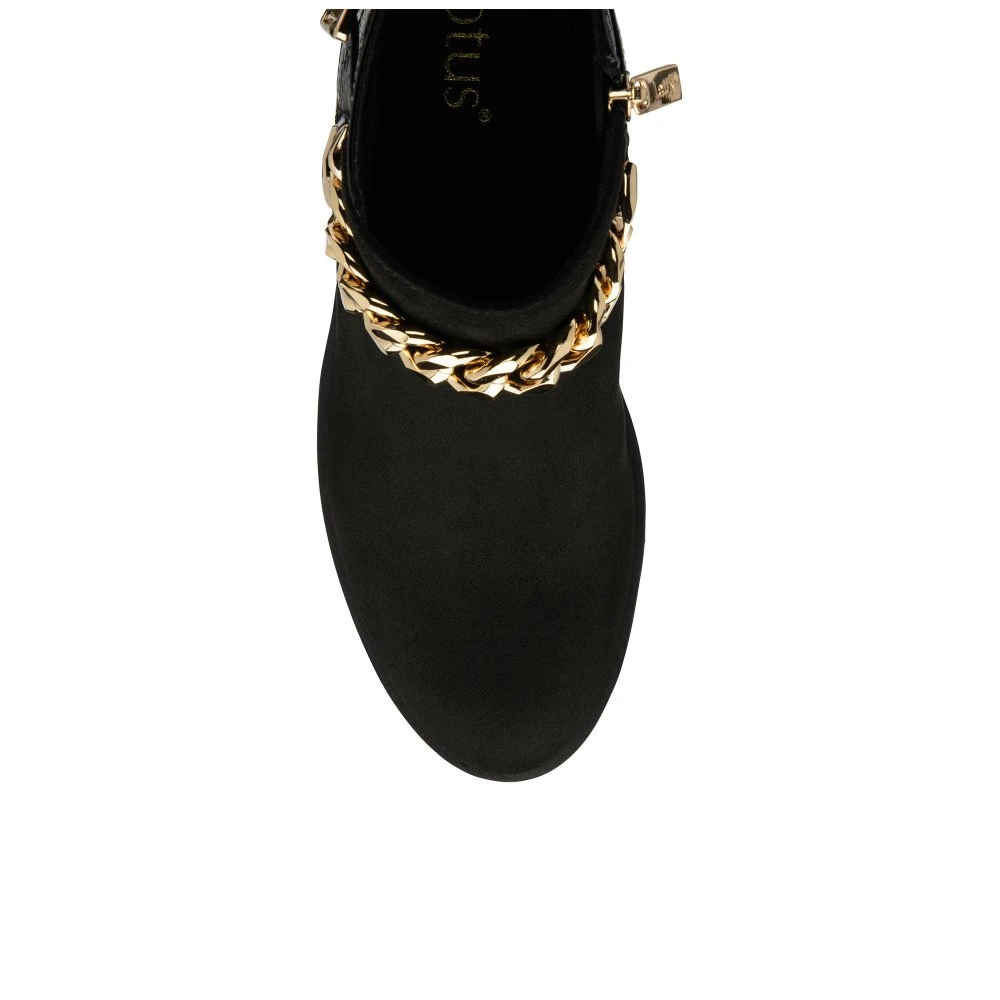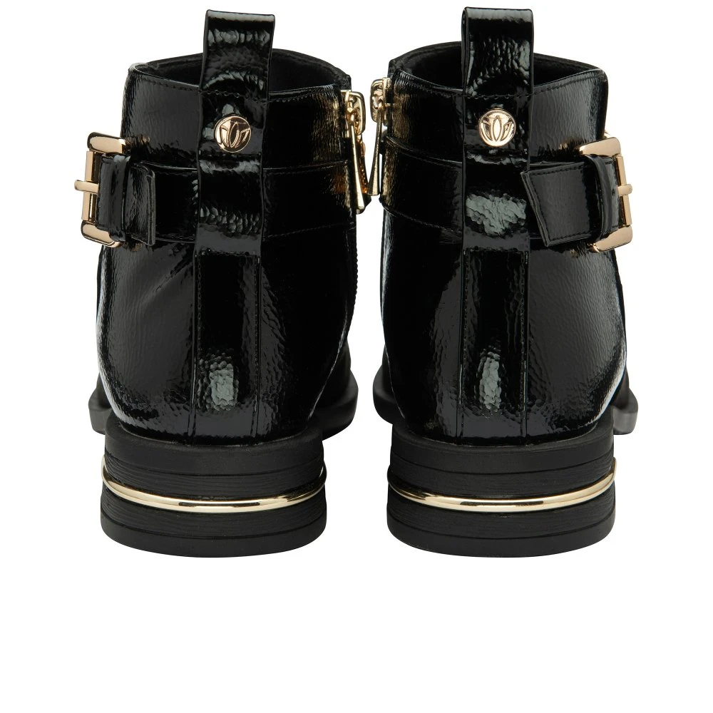 Giving this Lotus Kiri ankle boot a contemporary aesthetic is the heavy gold chain detailing that interlinks with a decorative buckle. This women’s round toe black boot unites imi-suede and mottled patent on the upper, plus a metal trim insert has been encompassed within the wearable 3cm block heel.
