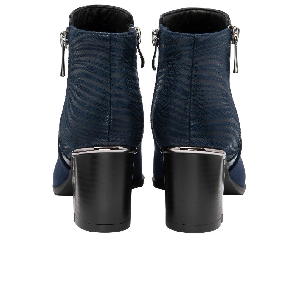 The Lotus Rebecca ankle boot is a highly versatile style. Boasting a textile upper that is accentuated by trims that encapsulate a reptile print. Other decorative features include an exposed zip and a mirrored plate and trim on the 6.5cm block heel.