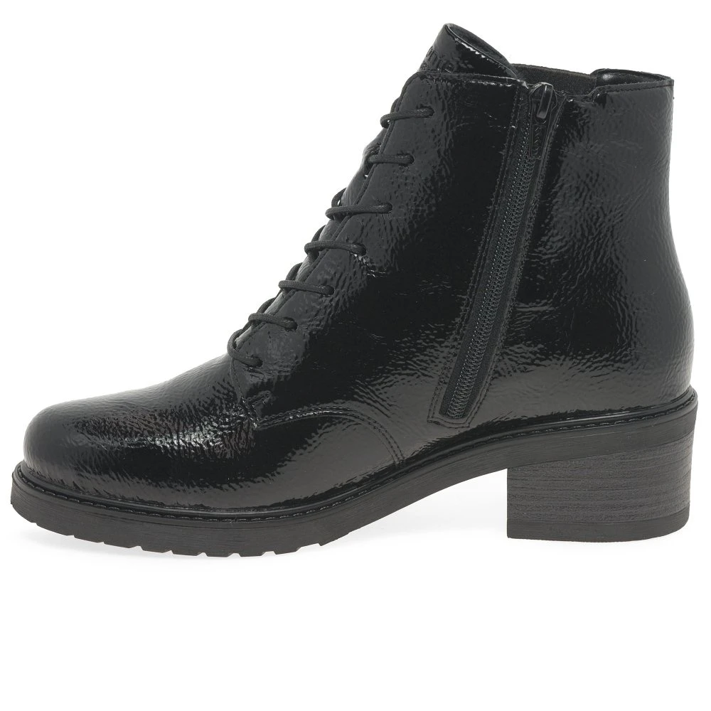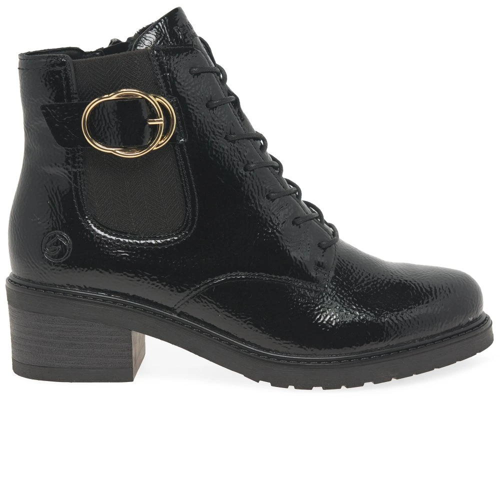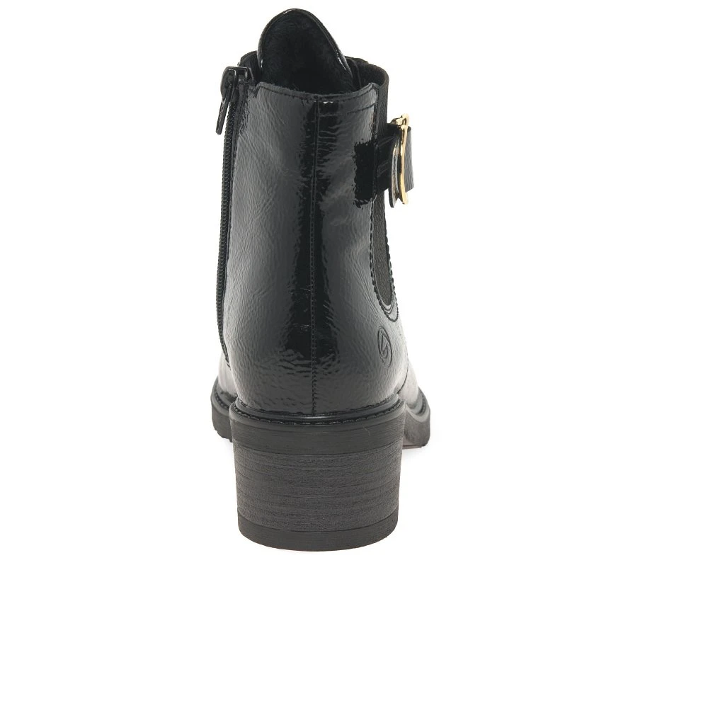 A stylish pair for everyday wear, the Remonte Sheree women’s ankle boots feature glossy synthetic patent uppers complete with gold hardware detailing. Dual fastenings allow for a secure and personalised fitting.